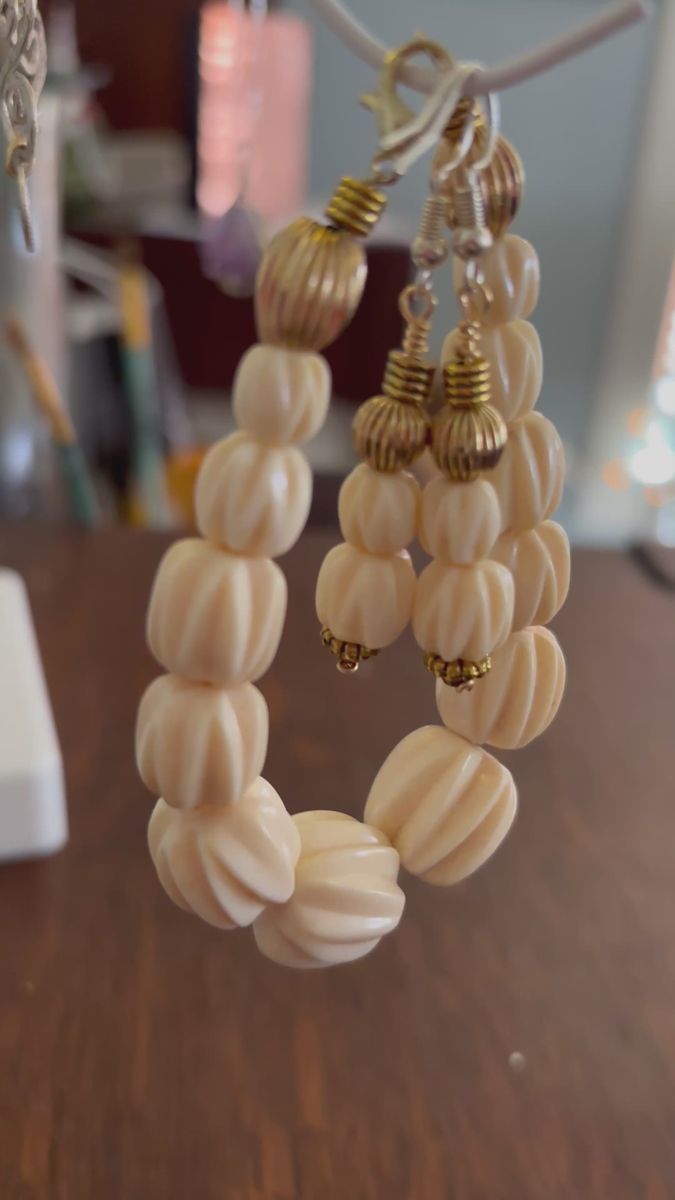 Once a classic necklace from a bygone era, her beads have been carefully separated, polished, and transformed into new life. Cream-toned with a delicate carved texture and warm gold accents, she carries the charm of the 1950’s — pearl gloves, quiet grace, Sunday tea, romance written on paper instead of screens.